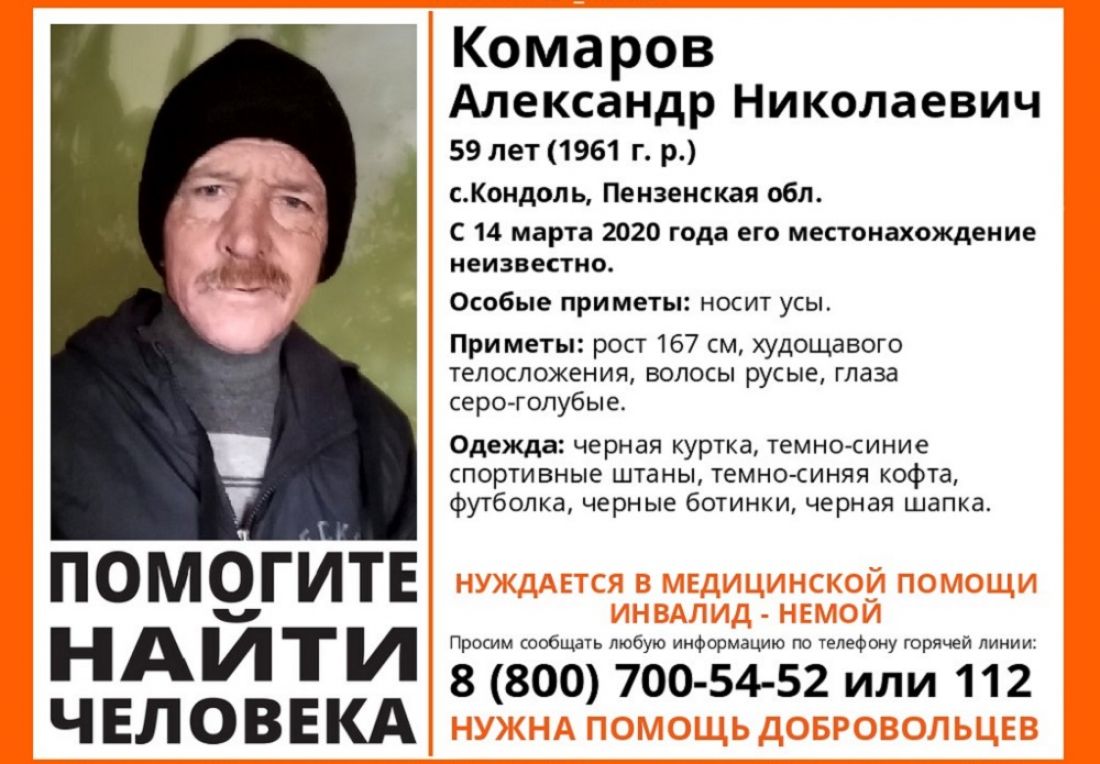 Добровольцы отряда «Лиза Алерт» сообщили о пропаже 59-летнего жителя села Кондоль Пензенского района. О местонахождении Александра Комарова ничего неизвестно с 14 марта.