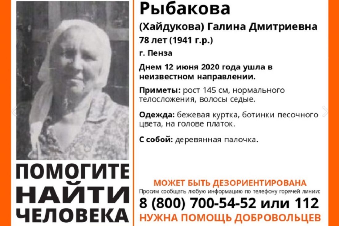 Жителей области просят помочь в поисках 78-летней женщины. Галина Рыбакова (Хайдукова) из Пензы накануне днем ушла в неизвестном направлении и до сих пор не вернулась домой.