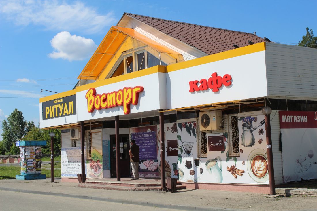 Под одной крышей ютятся небольшая закусочная и погребальная контора. Общее единение олицетворяет надпись «восторг» прямо по центру строения, выросшего из остановочного павильона. Так как фирмы занимают равную площадь, надпись, вероятно, относится к обеим.