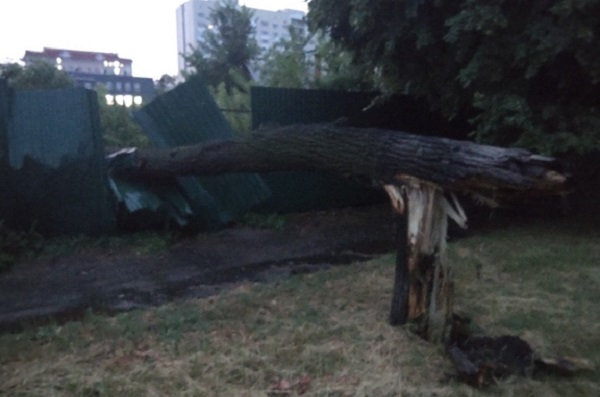 Под натиском стихии разламывались даже большие деревья. В одном месте дерево рухнуло прямо на забор, который повредился от тяжести.