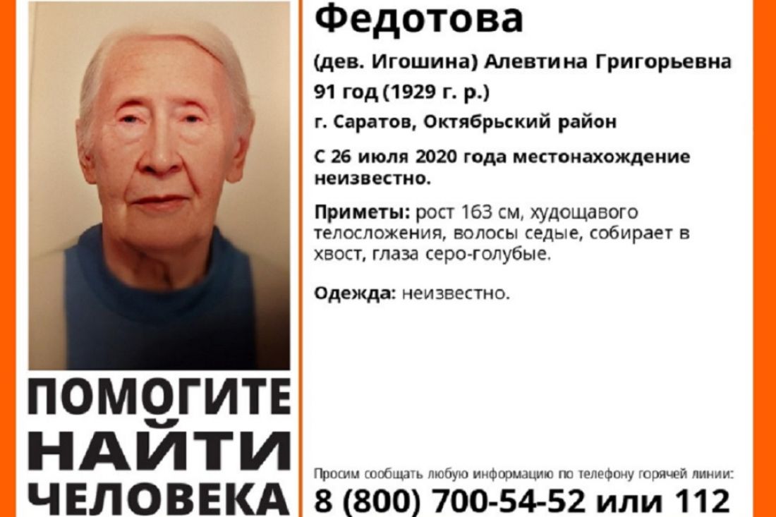 В Октябрьском районе Саратова более недели назад пропала 91-летняя пенсионерка. Алевтина Федотова (девичья фамилия – Игошина) ушла из дома 26 июля. До сих пор у родственников нет информации о ее местонахождении.