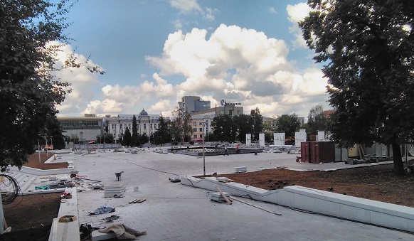 Лишь возле остановки на улице Кирова фонтан не прикрыт забором, и отсюда можно увидеть, как меняется площадь.
