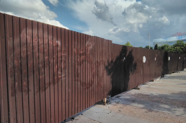 Площадь обнесена высоким забором. Большую свободную поверхность в Пензе традиционно пытаются исписать или изрисовать, но тут за этим тщательно следят и все каракули закрашивают.