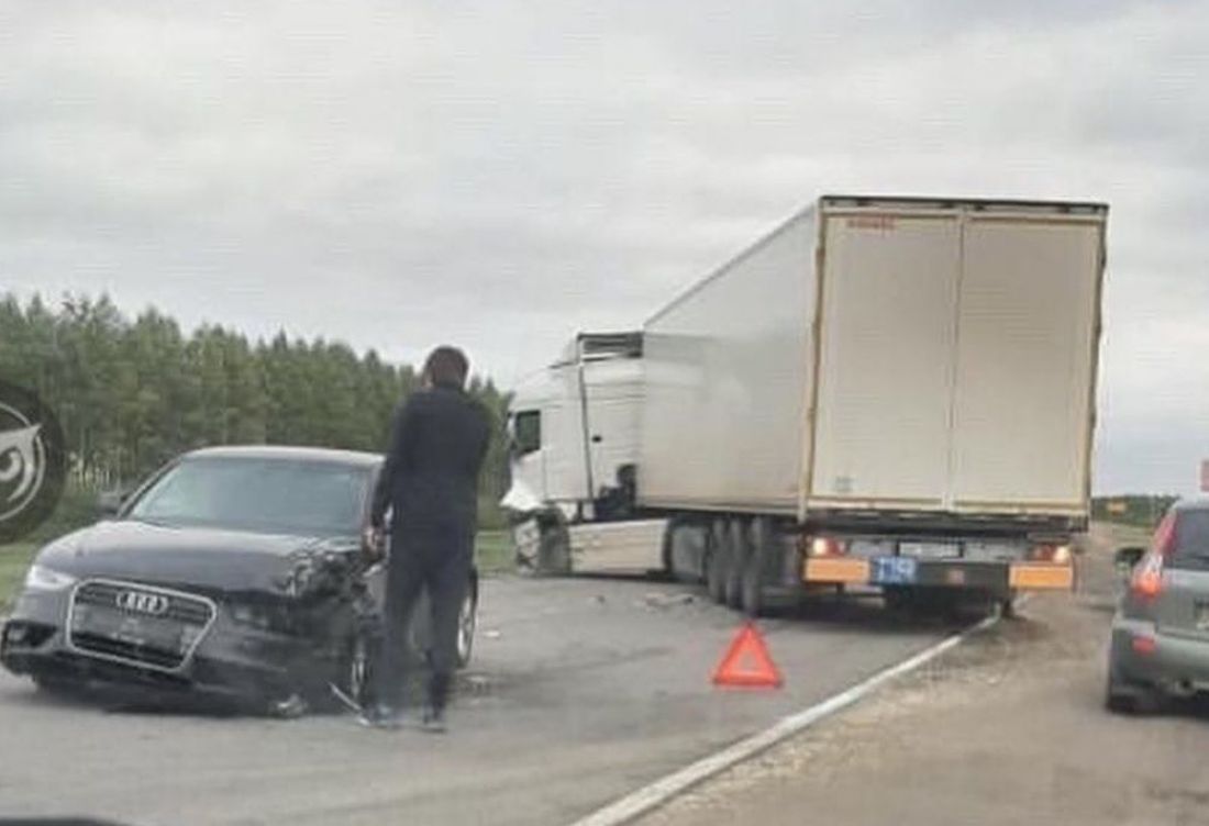 Также на трассе остался легковой автомобиль «Audi» с разбитой передней частью. О пострадавших очевидец ДТП не сообщает. К моменту съемки на место прибыл автомобиль ДПС.