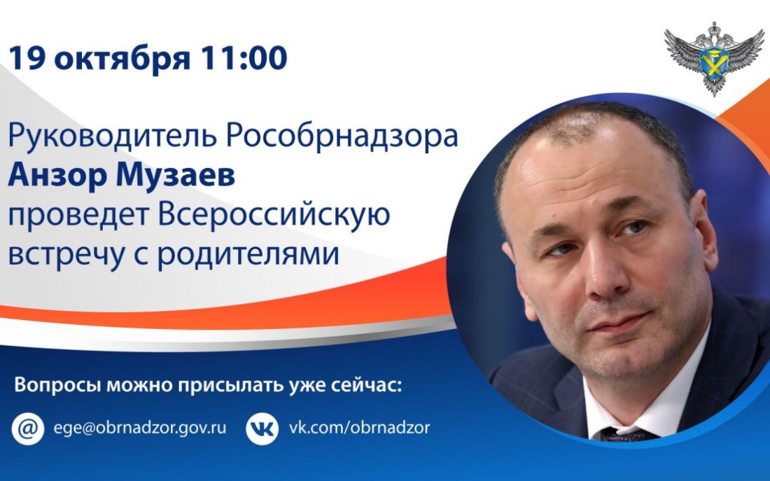 9 октября в 11 часов планируется провести всероссийскую встречу руководителя Федеральной службы по надзору в сфере образования и науки Анзора Музаева с родителями учащихся.