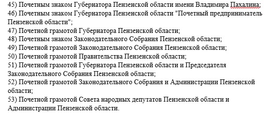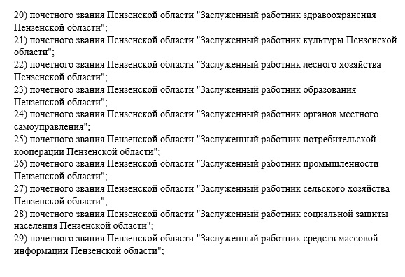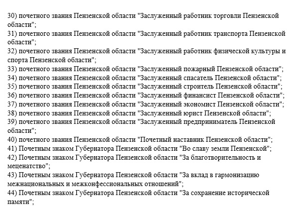 Список необходимых для получения звания наград может от региона к региону отличаться значительно, приведем в пример Пензенскую область, где он состоит из 53 пунктов и двух подпунктов:
