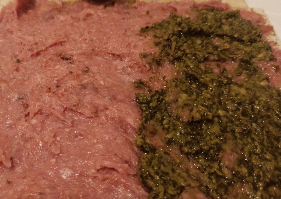 2. На половину слоя фарша аккуратно нанесите треть соуса песто, также стараясь распределить его равномерно.