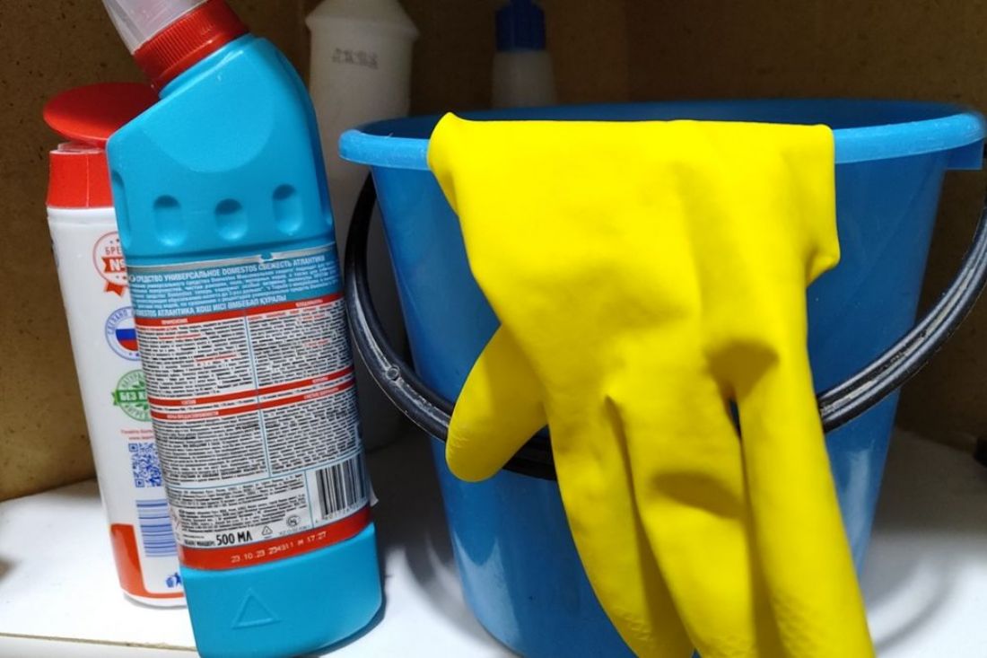 Чтобы не бегать за каждой бутылкой, удобно держать всю бытовую химию в одном месте. Для этого подойдет небольшое ведро или корзина. В нее можно сложить универсальное средство для поверхностей, жидкость для стекол, а также отдельные средства для кухни и ванной.