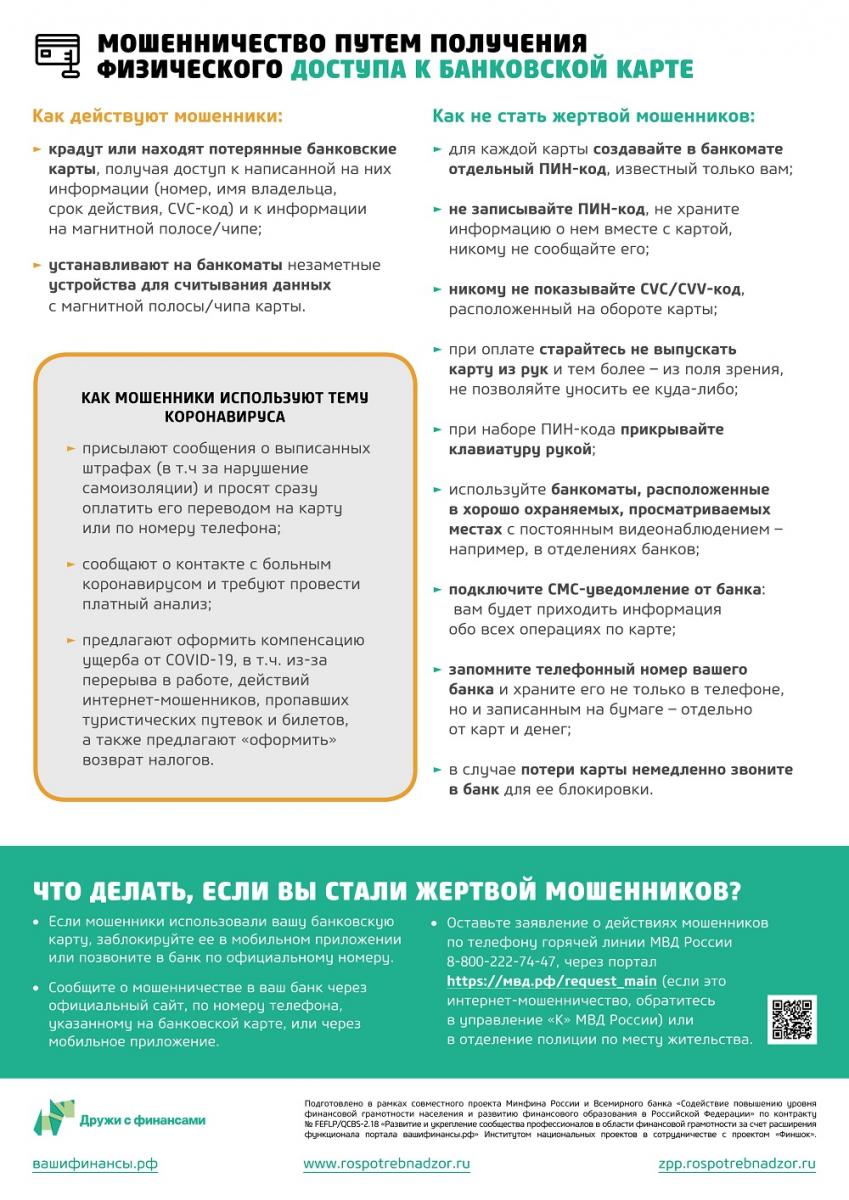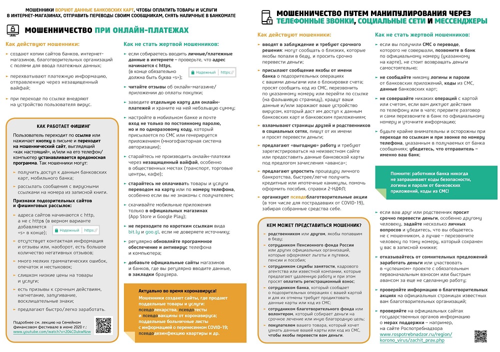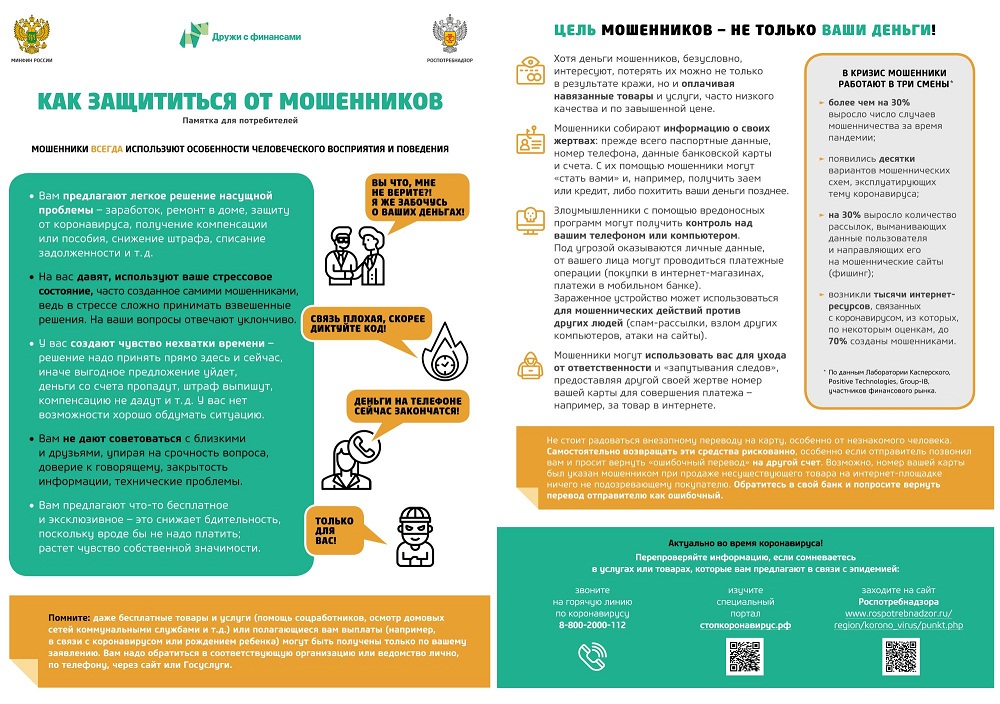 Специалисты Роспотребнадзора разместили на своем сайте рекомендации, как не стать жертвой мошенников. Памятки для потребителей они разработали вместе с экспертами и партнерами проекта Минфина РФ «Содействие повышению уровня финансовой грамотности населения и развитию финансового образования в Российской Федерации». В них специалисты рассказали о схемах, которые часто используют мошенники, в том числе, назвали новые методы обмана в связи с распространением коронавируса.