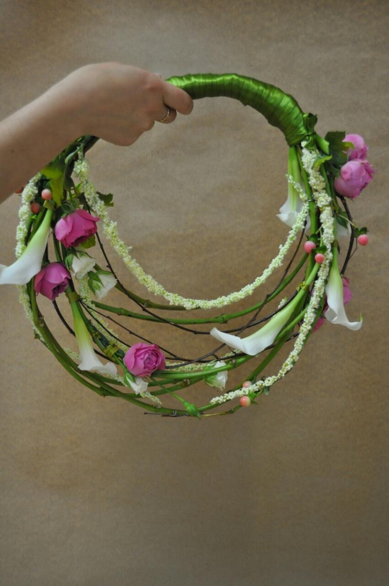 Выставила фото в соцсетях и получила очень хорошие отзывы, нашлись желающие приобрести, потому что получилось очень свежо и по-весеннему. Так что оригинальная идея оказалась очень даже жизнеспособной. Мне нравится работать с природными материалами. Однажды невеста заказала для себя необычный свадебный букет с каллами, основой которого стала лоза. Его нужно было носить на руке как сумочку.