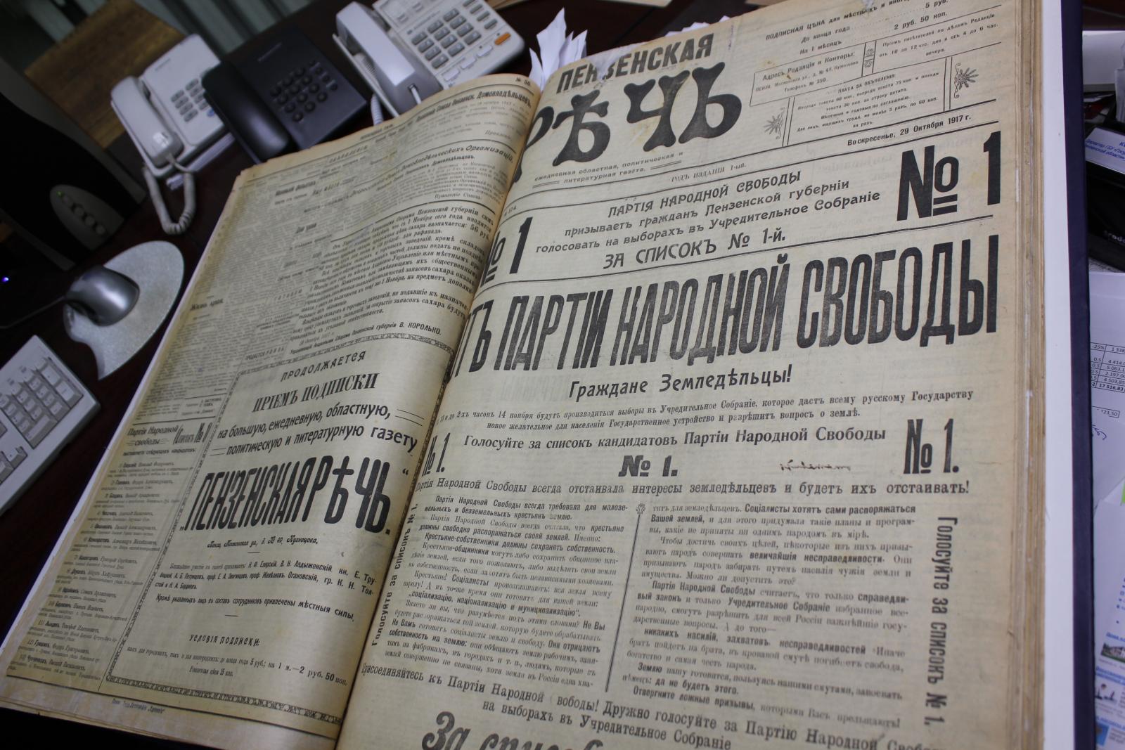 - Документов, датированных седьмым ноября (25 октября 1917 года) телеграмм, заметок, сообщений о том, что произошла революция не существует, пензенцы впервые узнали о том, что происходит в Петрограде, позже. Главный источник сведений о тех октябрьских днях – газеты. В областном архиве сохранились подшивки губернских изданий «Известия» пензенского совета рабочих и солдатских депутатов и «Пензенская речь», которая позиционировала себя как независимая газета и придерживалась в основном правых взглядов. Большевистских газет в губернии в то время не выходило, да и большевиков было еще крайне мало».