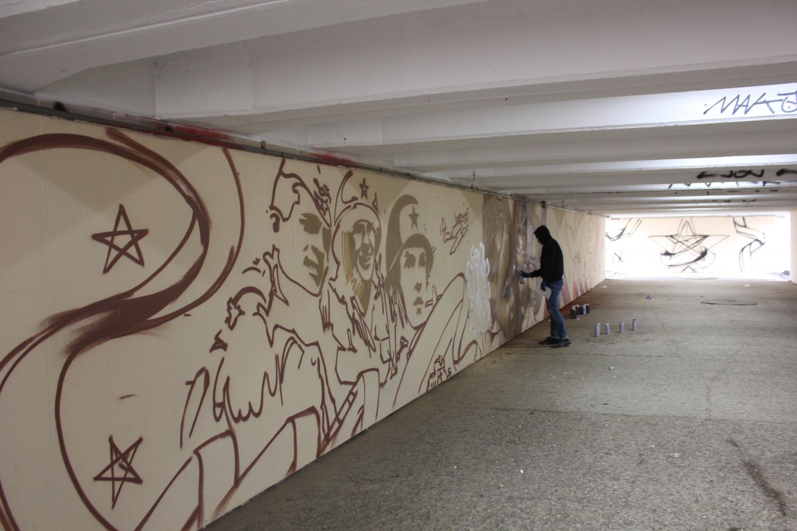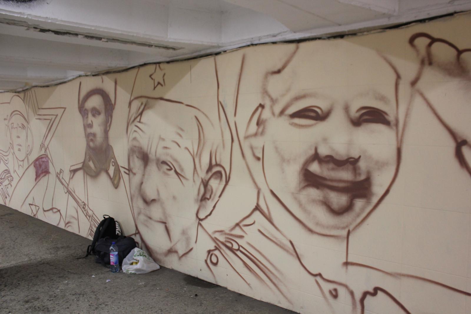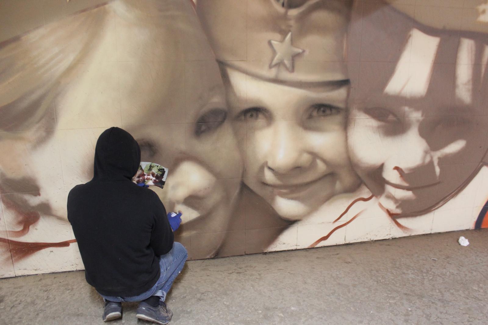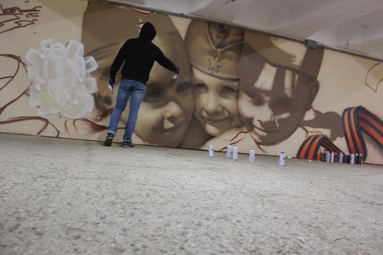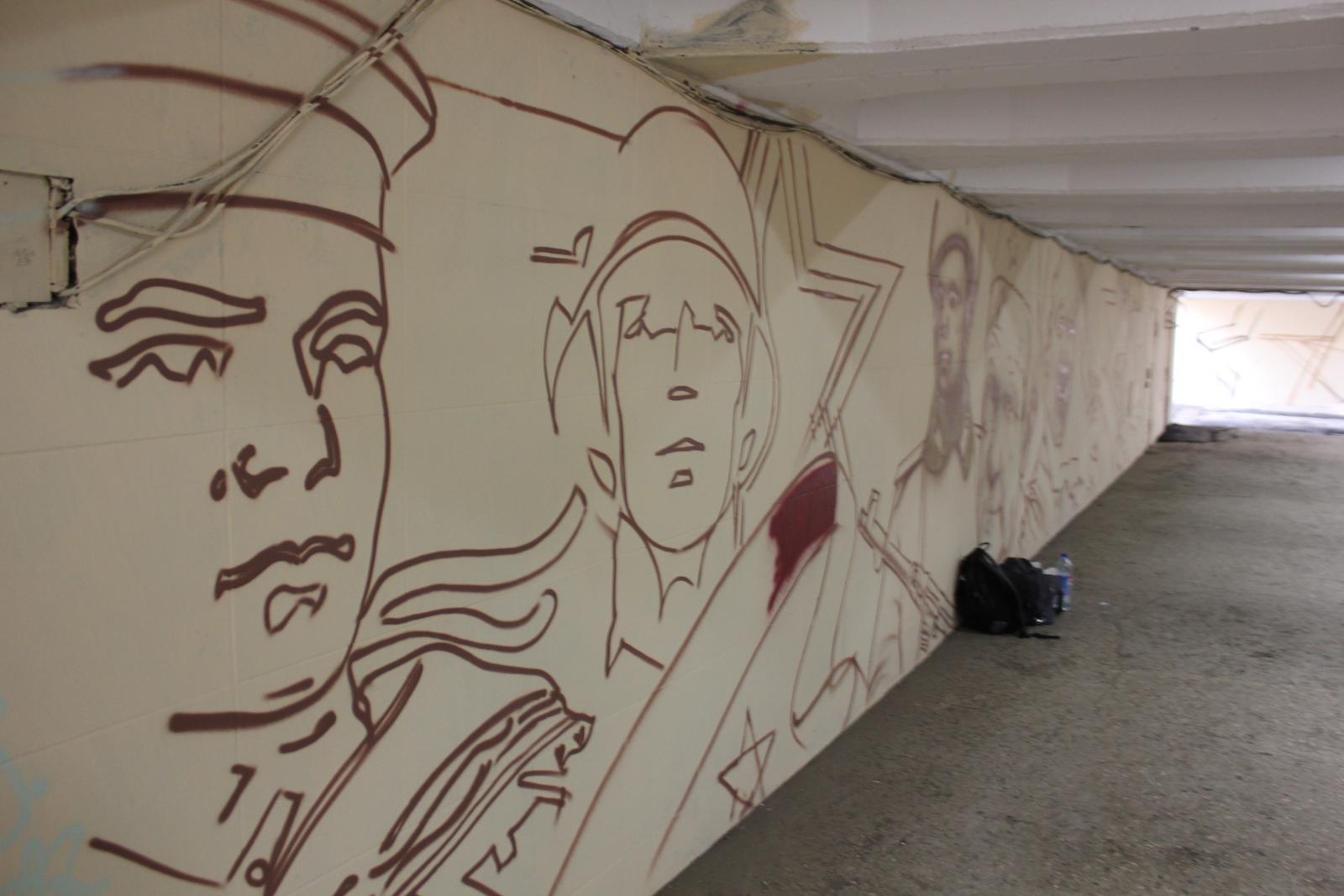 - Поставлена цель написать полотно в честь Великой Отечественной войны, так как сам переход находится на проспекте Победы, тематика этому соответствует. Для меня трудность была в компоновке росписи, сложно было сделать эскиз, потому что работа достаточно вытянута, и рисунки располагаются фактически длинной полосой.
