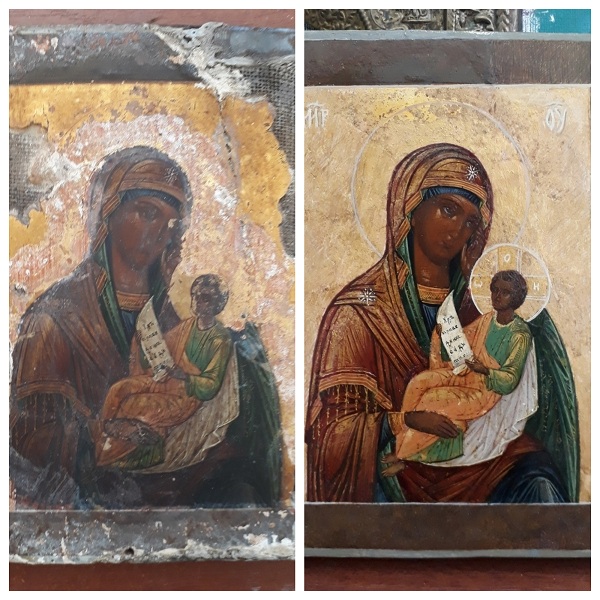- Каждую икону можно отреставрировать, просто не все процессы на ней можно провести. Бывает, есть доска, и на ней 2-3 островка живописи. Понятно, что восстанавливать изображение уже нет никакого смысла, потому что это уже будет похоже на фальсификацию, потому что ты дописываешь икону своей рукой, то есть от авторской живописи уже ничего не остается. Если это музейная икона, то она так и будет представлена в музее. Конечно, для храма такой вариант не очень хорош. Если утрат меньше, чем 50%, то вполне можно восстановить. Тонировка, проведенная реставратором, собирает все изображение, чтобы ничего твой взгляд не отвлекало. Но она ни в коем случае не должна восприниматься как авторская живопись.