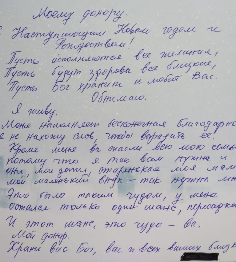 Так было и со мной. Я знаю только, что это женщина и для нее мой костный мозг был последним шансом. Оказалось что я стопроцентно подхожу ей по параметрам крови. Это, как говориться, мой генетический близнец. Не по группе крови, а по другим более точным параметрам.