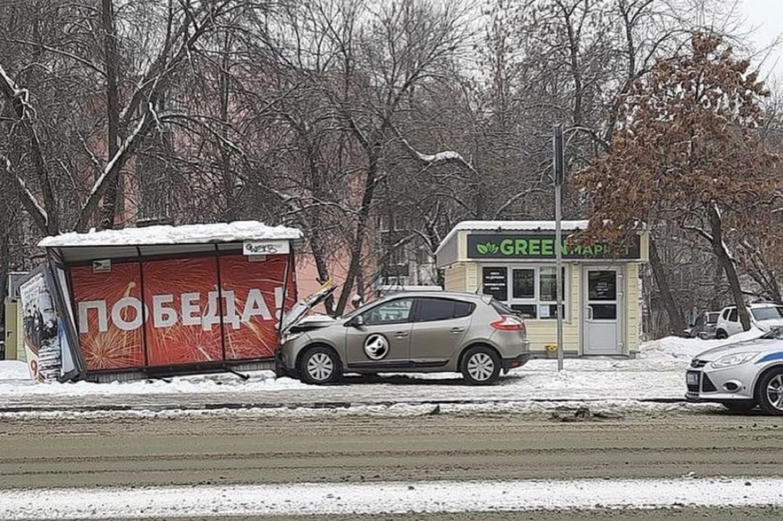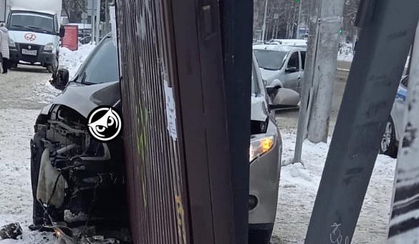 Водитель иномарки не справился с управлением, в результате чего автомобиль врезался в остановочный павильон. Столкновение оказалось жестким: сооружение деформировано, а машина разбита.