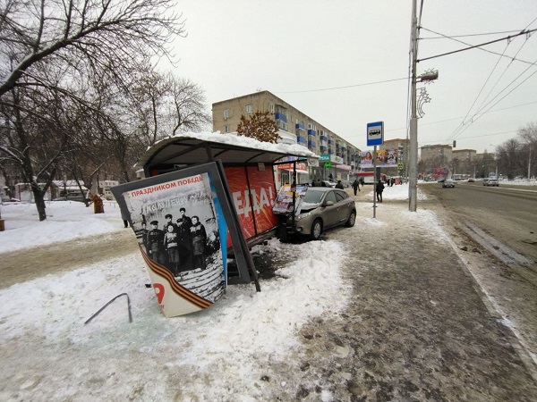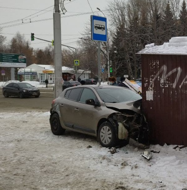 Автомобиль марки «Renault Logan» врезался в остановочный павильон, повредив конструкцию. Передняя часть кузова легковой машины сильно повреждена, оторвавшиеся от легковушки детали лежат возле искореженного павильона.