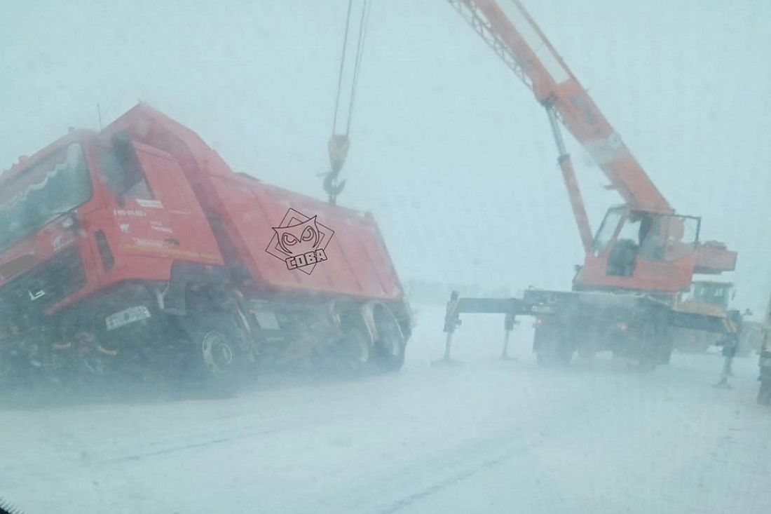 Автомобиль пытаются поставить ровно на все четыре колеса с помощью крана, которым транспортное средство вытягивают на дорогу. Подробности дорожного инцидента в настоящее время выясняются.