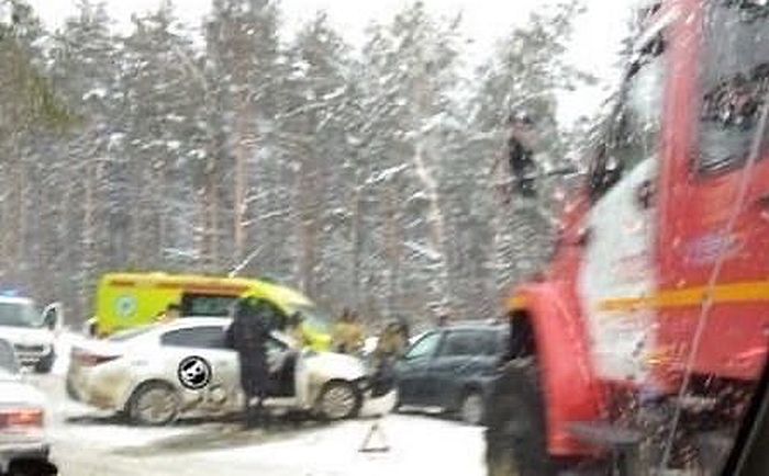На снимках видно, что к месту ДТП прибыли сотрудники скорой помощи и пожарная машина. Сведения о пострадавших в результате аварии уточняются.