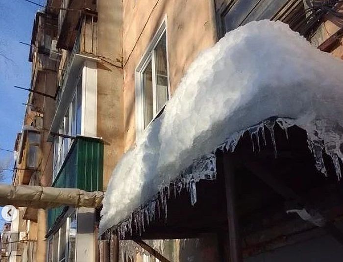 На проводах над тротуаром в центре Пензы зависла ледяная «птица». Реальная опасность угрожает людям, которые вынуждены идти по тротуару на улице Володарского.