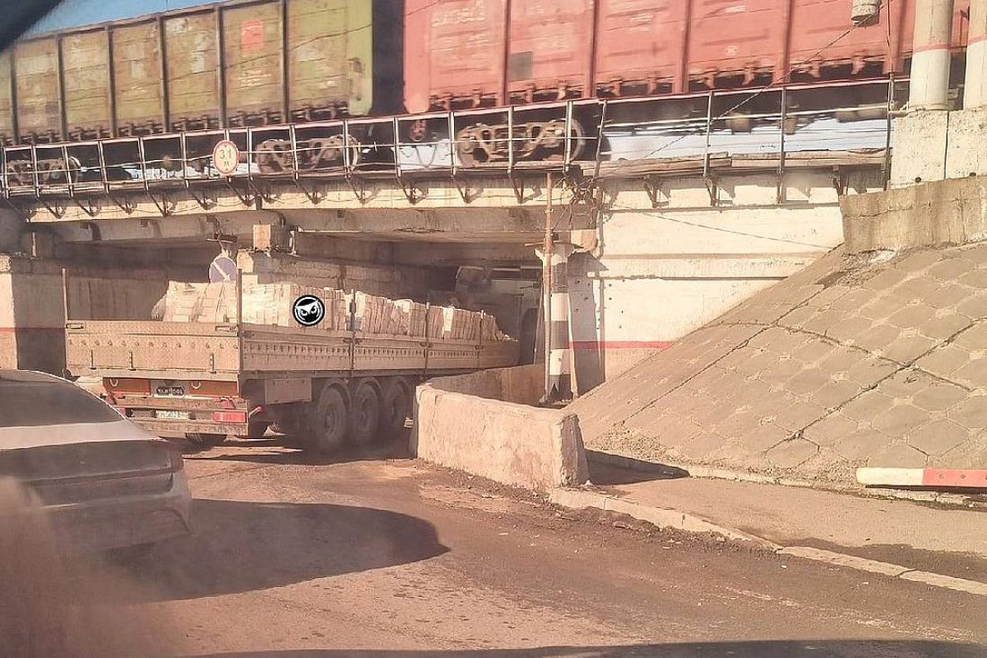 Под железнодорожным мостом в Пензе застрял грузовик с прицепом