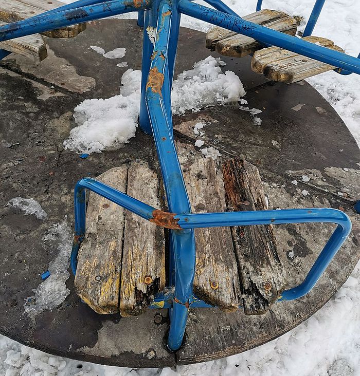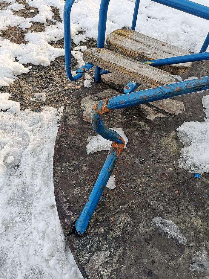 Около дома №10 находились карусели, которые ретивые коммунальщики то ли не заметили под снегом, то ли не проявили достаточной аккуратности. В результате местами игровая конструкция обрела причудливые формы.