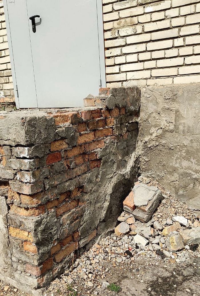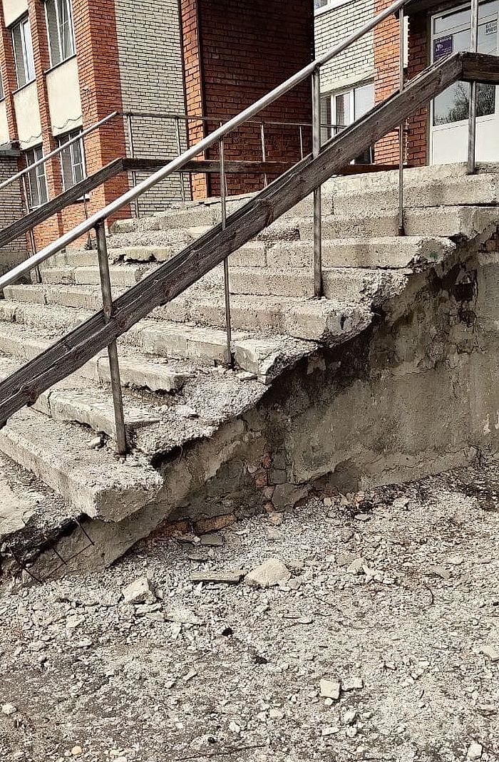 Видно, что обломками ступеней буквально усеяна территория рядом с лестницей. Также рушится кладка лестницы, ведущей, судя по всему, к одному из запасных входов в учебное заведение.