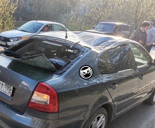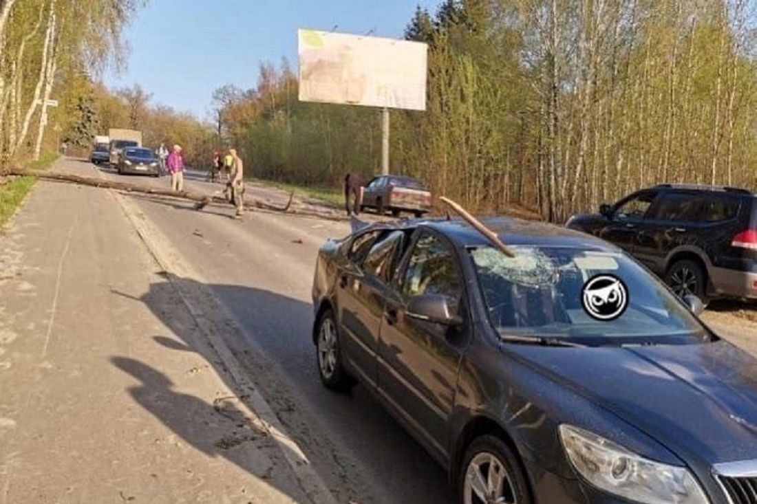 На снимках, опубликованных в сообществе, запечатлена проезжая часть и лежащее на ней дерево. Также на фото искореженная в результате падения дерева машина.