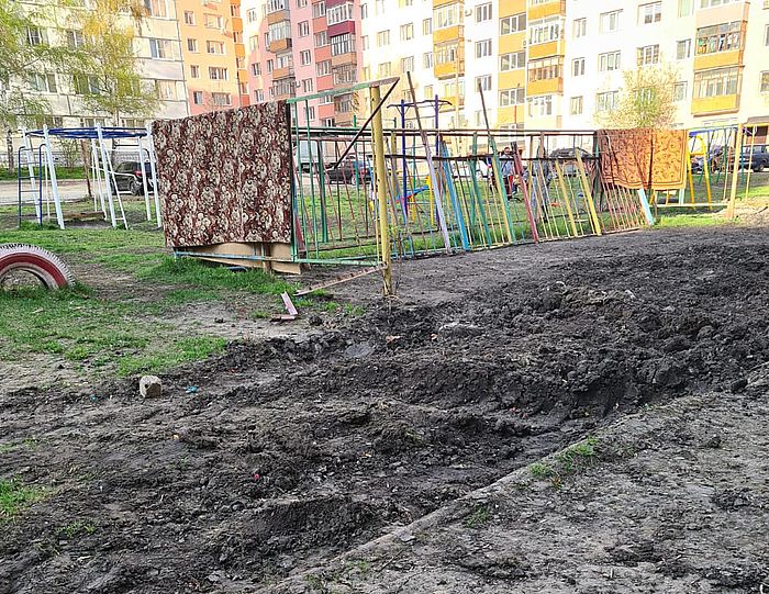 Апогей «благоустройства» - глубокая яма с выброшенной в нее конструкцией позади детских качелей без сидения.