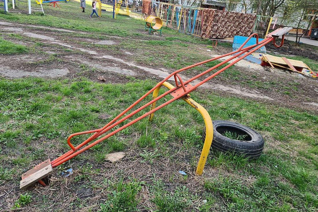 Качели без сидений дополняют разрушенные песочницы.