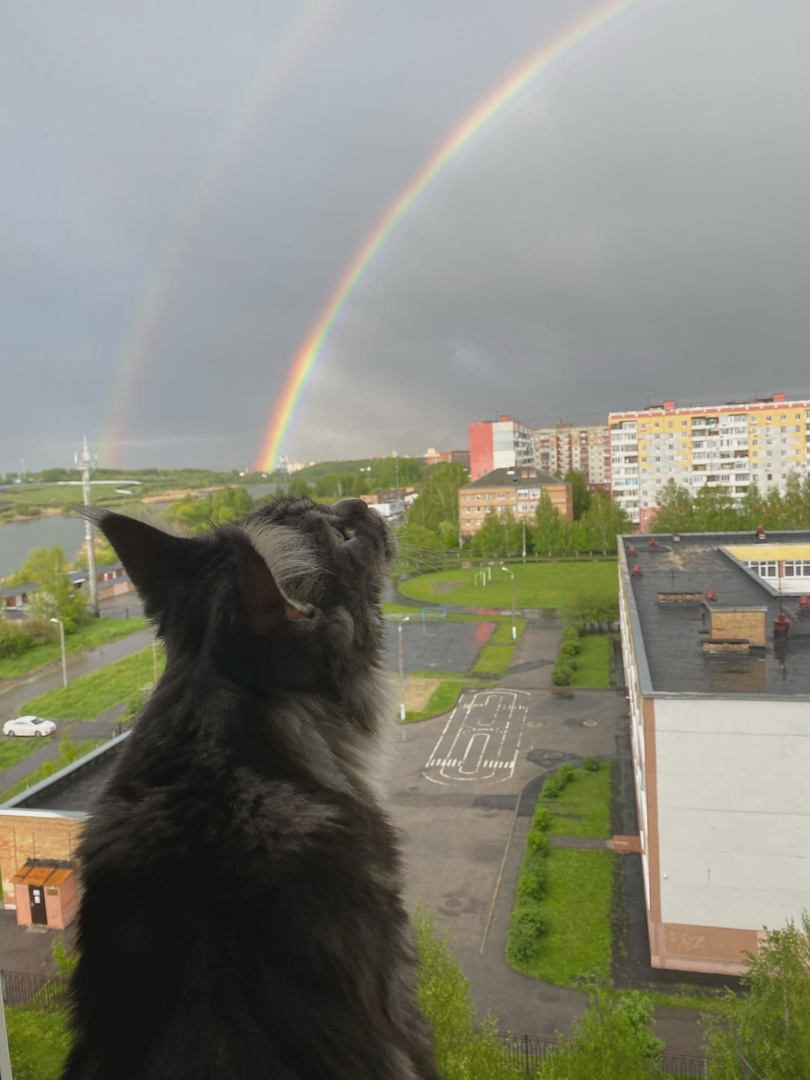 Погода весь день не могла определиться - дождь или солнце. И уже на закате это сочетание, наконец, привело к образованию необычайно четкой двойной радуги. Любители сверхъестественного считают ее хорошим знаком.