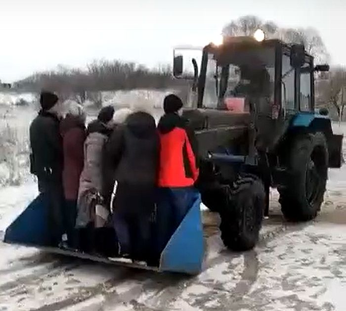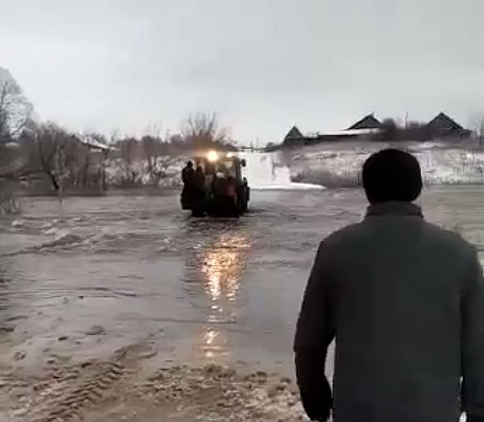 В группе «Подслушано в Кузнецке» социальной сети «ВКонтакте» появилось видео, в котором несколько сельчан загружают в ковш трактора и таким образом перевозят через затопленный участок.