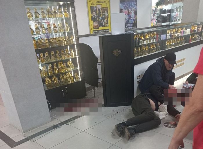 На полу ТЦ лежал окровавленный мужчина. Лужа крови была замечена также около одной из витрин.