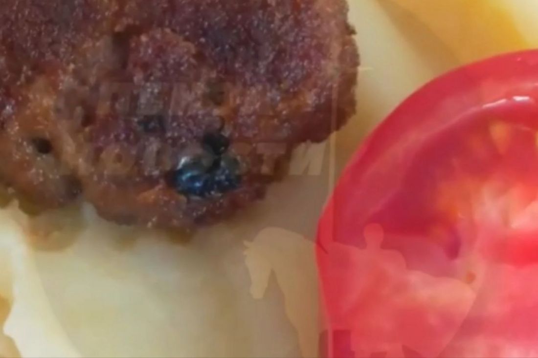 На кадрах видно черное пятно внутри котлеты. Когда очевидец начинает разламывать ее, можно разглядеть насекомое.