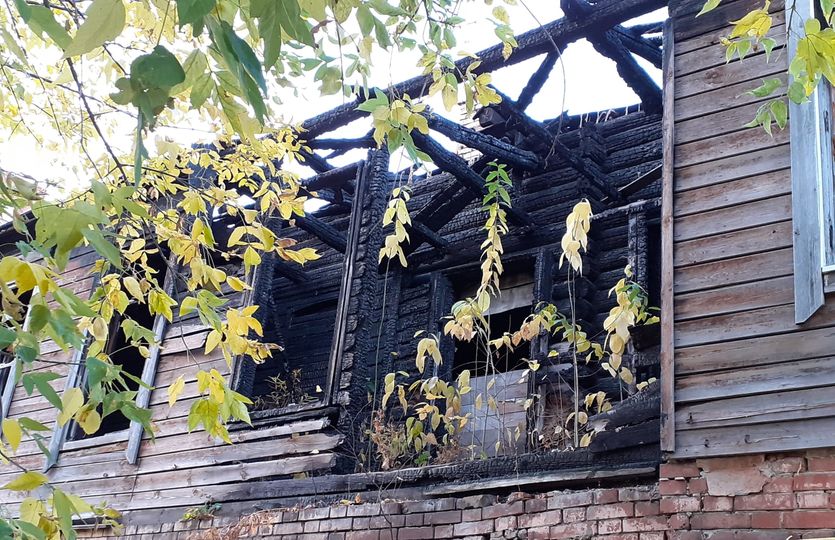 Дом расселили несколько лет назад после другого пожара. Строение не отремонтировали и закрыли баннером до лучших времен. Впрочем, следы пожара до сих пор заметны с торцевой стороны. Эту фотографию автор публикации сделал за неделю до очередного возгорания.