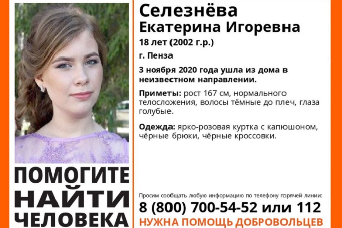 В Пензе накануне, 3 ноября, пропала 18-летняя жительница областного центра. Екатерина Селезнева ушла из дома в неизвестном направлении.