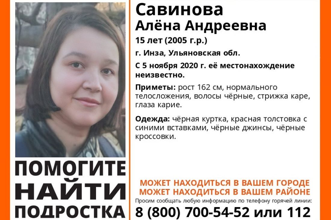 С 5 ноября неизвестно, где находится 15-летняя Алена Савинова из города Инза Ульяновской области. О пропаже девочки-подростка сообщили волонтеры поискового отряда «Лиза Алерт».