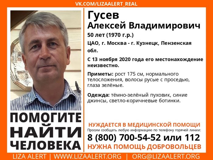 Как сообщается в паблике, 50-летний Алексей Гусев проживает в Центральном административном округе Москвы, но при этом может находиться в Пензенской области, возможно в Кузнецке.