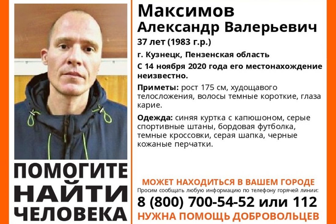 С 14 ноября неизвестно местонахождение 37-летнего жителя Кузнецка Александра Максимова. О пропаже мужчины сегодня сообщили волонтеры пензенского отделения поискового отряда «Лиза Алерт».