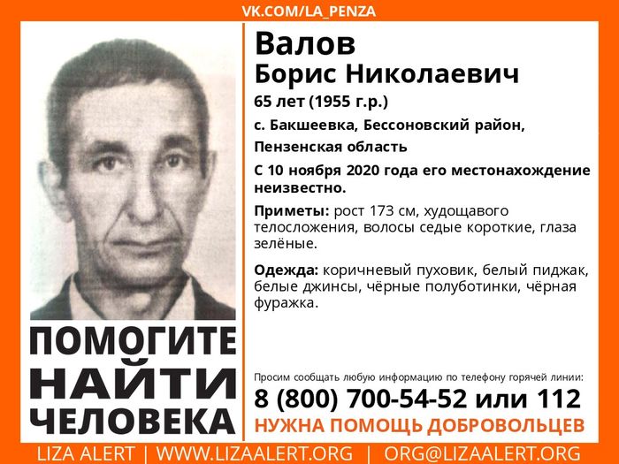 С 10 ноября 2020 года нет информации о местонахождении 65-летнего Бориса Валова. Мужчина проживает в селе Бакшеевка Бессоновского района.