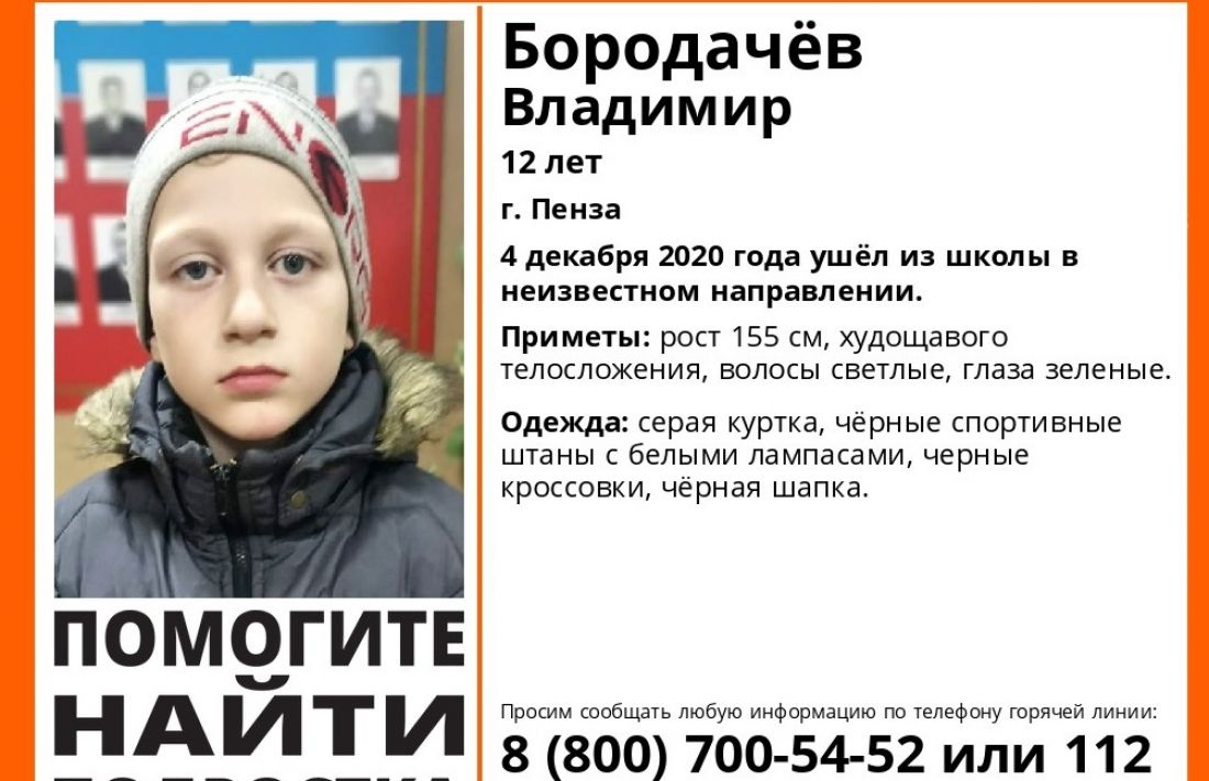 В Пензе 4 декабря 12-летний Владимир Бородачев ушел из школы в неизвестном направлении, поисками ребенка занимаются добровольцы и полиция.