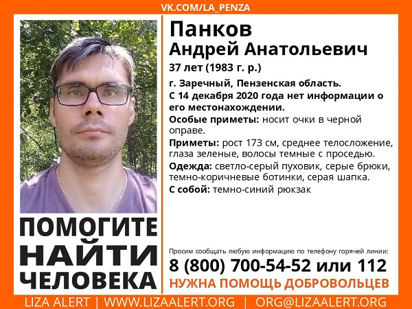 С 14 декабря нет информации о местонахождении 37-летнего зареченца Андрея Панкова. О его пропаже сообщили представители пензенского отделения поискового отряда «Лиза Алерт».