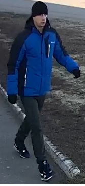 Мужчина славянской внешности, на вид 30-35 лет, худощавого телосложения, рост 180-185 см, одет в черную вязаную шапку, утепленную куртку с капюшоном голубого цвета с темными вставками на рукавах и плечах, вязаные перчатки темного цвета, джинсы темно-зеленого цвета, синие кроссовки с белой подошвой.