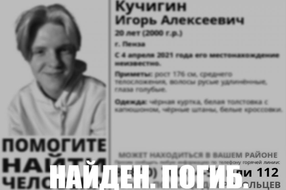 Исчезнувший 4 апреля 20-летний Игорь Кучигин из Пензы был найден мертвым. Информация об этом появилась в социальной сети «ВКонтакте».
