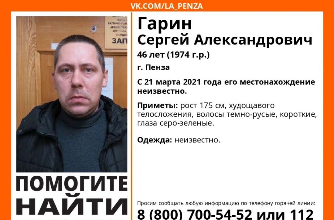 В Пензе пропал 46-летний Сергей Гарин. Его местонахождение неизвестно с 21 марта.