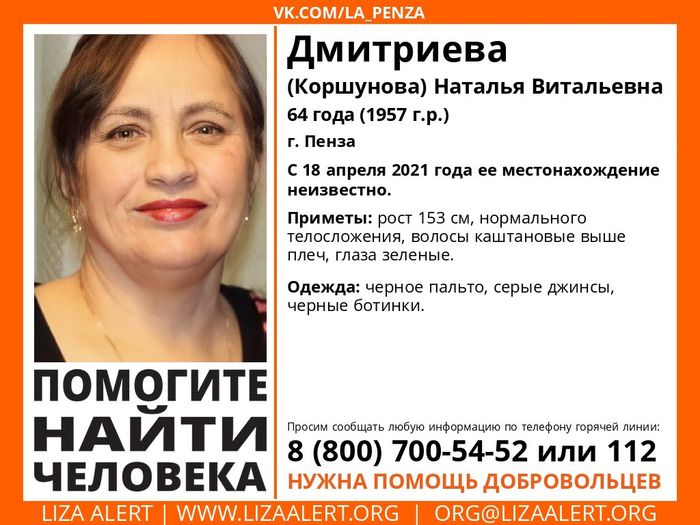 С 18 апреля остается неизвестным местонахождение 64-летней жительницы Пензы Натальи Дмитриевой (Коршуновой). Ее поиски объявлены полицией и волонтерами отряда «Лиза Алерт».