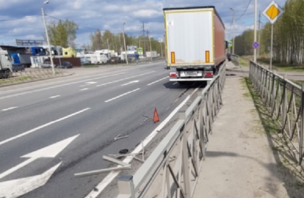 По словам автора поста, фура снесла металлические ограждение, разделяющее пешеходную зону от дороги. «Хорошо, что не было людей на тротуаре», - отметил свидетель инцидента.