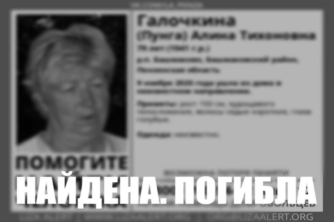 Пензенский отряд «Лиза Алерт» сообщил о прекращении поисков 79-летней Алины Галочкиной, которую пытались найти на протяжении полугода. На днях появилась информация о том, что женщина погибла.
