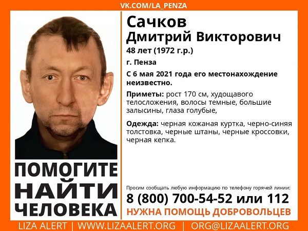 В официальной группе в социальной сети «ВКонтакте» волонтеры опубликовали приметы пропавшего мужчины. Дмитрий Сачков ростом 170 сантиметров, у него худощавое телосложение, темные волосы, большие залысины, голубые глаза. На момент исчезновения на нем были черная кожаная куртка, черно-синяя толстовка, черные штаны и кепка, на ногах – черные кроссовки.