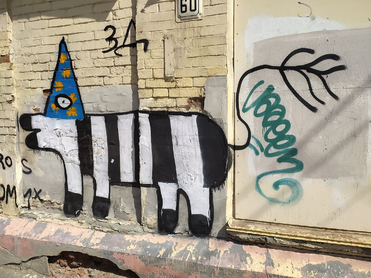 Дорожная разметка пешеходных переходов, именуемая не только в народе, но и во вполне официальных документах «зеброй», за зиму практически стерлась. Это общая тенденция, к концу зимы дорожные «зебры» переходят в разряд редких и исчезающих, что создает определенные проблемы для автомобилистов и пешеходов. Восстановление, конечно, идет, но это занимает не одну неделю. Видимо, чтобы хоть как-то восполнить эту брешь, неизвестный автор граффити выбрал в качестве героя своего не совсем законного произведения именно это копытное.