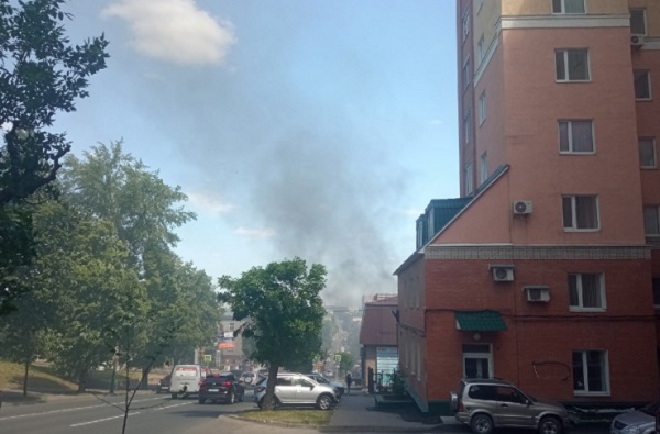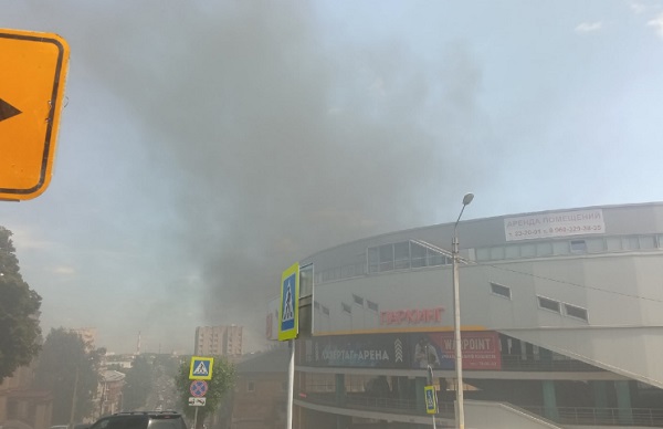 Рядом с местом пожара расположена будка, на которой написано: «Огнеопасно! Газ». Дым исходит из двора, разделяющего улицы Московскую и Володарского.